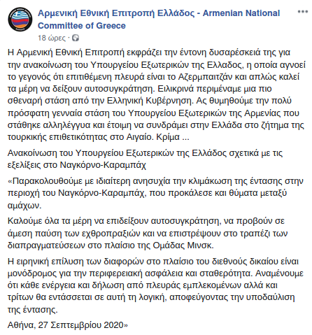 ”Επαναλαμβάνουμε τη σαφή υποστήριξη και την αλληλεγγύη της Αρμενίας με την Ελλάδα και την Κύπρο και καλούμε την Τουρκία να αποκλιμάξει την κατάσταση, να σεβαστεί το Διεθνές Δίκαιο και να σταματήσει όλες τις ενέργειες εντός της Αποκλειστικής Οικονομικής Ζώνης (ΑΟΖ) της Ελλάδας και της Κύπρου.”