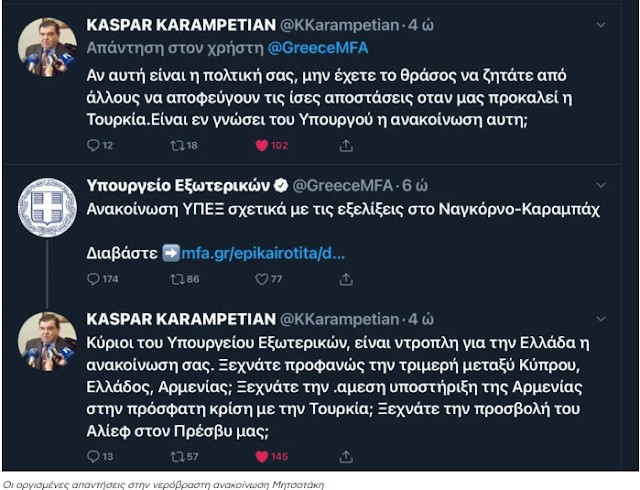 ΚΑΣΠΑΡ ΚΑΡΑΜΠΕΤΙΑΝ: “Κύριοι του Υπουργείου Εξωτερικών, είναι ντροπή για την Ελλάδα η ανακοίνωση σας. Ξεχνάτε προφανώς την τριμερή μεταξύ Κύπρου, Ελλάδος, Αρμενίας; Ξεχνάτε την άμεση υποστήριξη της Αρμενίας στην πρόσφατη κρίση με την Τουρκία; Ξεχνάτε την προσβολή του Αλίεφ στον πρέσβη μας;”